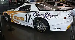 In 2004, the alcoholic beverage company, Diageo became the series' title sponsor, utilising their Crown Royal brand whiskey, replacing True Value, and the procedure changed as well. Cars would be identically painted in white, with trim which could be changed to represent the driver's colors in his regular racing series. Also, a driver's number in IROC would be his regular number. Thus, Steve Kinser would use green trim with the No. 11, and Matt Kenseth's car featured yellow trim with No. 17.