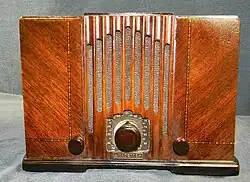 Shortly thereafter,[nb 1] IRC introduced the Kadette, the first mass-produced AC/DC radio;[6] it was a four-tube, 6-pound (2.7 kg) radio small enough to be easily portable that featured an innovative plastic cabinet.[3][4] This cabinet material, called Bakelite, was fairly cheap to produce and helped IRC to turn a substantial profit on its radio sales.[1] Manufactured by the Chicago Molded Products Company, the Kadette's plastic cabinet was the first to be used on a radio, although its Gothic styling gave it a fairly traditional appearance. The radio also boasted an innovative new circuit design, while its ability to operate on either alternating (AC) or direct current (DC) allowed it to operate without a power transformer, resulting in it being cheaper, smaller, and lighter than its competitors;[4] it also allowed the Kadette to be plugged into typical household wall sockets.[5] Furthermore, IRC released a kit that instructed customers how to modify their Kadettes for battery-powered mobile applications, such as in railroad cars and automobiles;[5] in the words of Robert E. Mayer, this kit "effectively started the car radio market".[3]