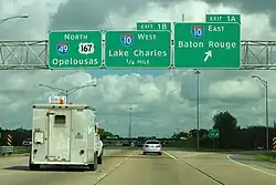1 I-10 (US 167 south / LA 182 north) – Baton Rouge, Lake CharlesSouthbound exit and northbound entrance; southern end of US 167 concurrency; signed as exits 1A (east) and 1B (west); exit 103B on I-10; cloverleaf interchange