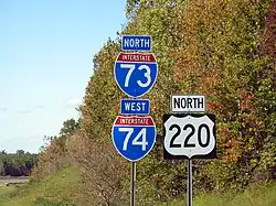 The 12.6-mile (20.3 km) portion from south of Steeds north to south of Ulah was completed August 27, 1996, and was the first road marked as I-74 (and I-73).[33] Future signage was also installed north to the Greensboro area.[34] The remainder of the 26 miles (42 km) of existing and new freeway between Ulah and Candor was also signed as I-73/I-74 along US 220. In 1998, NC 752, a freeway spur of I-77 was renumbered as the segment of completed I-74, from I-77 to US 601. On June 30, 1999, the freeway was extended an additional five miles (8.0 km) to US 52, south of Mount Airy. In April 2001, I-74 was overlapped with I-77 from the Virginia state line to exit 101.