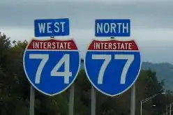 Interstate 74 (I-74) is a partially completed part of the Interstate Highway System that is planned to run from Davenport, Iowa, to Myrtle Beach, South Carolina. In the US state of North Carolina, I-74 currently exists in three distinct segments; from I-77 at the Virginia state line to US Highway 52 (US 52) near Mount Airy, from I-40 in Winston-Salem to US 220 near Ellerbe, and from US 74 and US 74 Business (US 74 Bus.) near Maxton to US 74/North Carolina Highway 41 (NC 41) near Lumberton. I-74 has an extensive concurrency with I-73 from Randleman to Ellerbe in the Piedmont. When completed, I-74 will link the cities of Mount Airy, Winston-Salem, High Point, Rockingham, Laurinburg, and Lumberton.