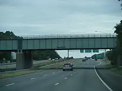 In Ridgefield Park, I-95 continues north as a toll-free highway cosigned with the New Jersey Turnpike and maintained by the NJTA.[2][9] This section of the Turnpike from this point to the George Washington Bridge approach is designated the “I-95 Extension” of the Turnpike.[10] It has a large interchange serving US 46, part of which was the original northern terminus of the turnpike before it was extended.[2] From this point, it has the appearance of a local–express lane configuration carrying three local lanes and two express lanes (3–2–2–3) in each direction, but the northbound "express" lane only leads exclusively to I-80 west while the northbound local lanes continues as the main trunk of I-95. (On the southbound side, the "express" lanes function as the main trunk of I-95 south while the southbound local lanes lead exclusively from I-80 east.) The road runs near suburban neighborhoods before entering Teaneck and intersecting with the eastern terminus of I-80. From here, I-95 turns northeast and splits into an actual local–express lane configuration with a 3–2–2–3 lane count, soon interchanging with CR 56 as it passes northwest of Overpeck County Park. The highway turns east as it skirts the border between Englewood to the north and Leonia to the south. After crossing CSX Transportation's Northern Branch, the highway enters inhabited areas as it passes over Route 93/CR 501 (Grand Avenue) and has a northbound exit and southbound entrance serving Broad Avenue.[2][5] I-95 forms a hairpin turn around Leonia to the southeast into Fort Lee and heads due south to Route 4. I-95 runs under the Edgewood Road Bridge here, an overpass that runs high above the highway, and is considered an iconic view for drivers entering New Jersey from the George Washington Bridge. After the overpass, I-95 runs in between the travel lanes of Route 4 as the freeway comes to a large interchange with southbound exits and northbound entrances for Route 4, US 1/9, US 46, and a full interchange with the southern terminus of US 9W (Fletcher Avenue). At this location, the New Jersey Turnpike officially ends and the jurisdiction changes from the NJTA to the PANYNJ.[2]