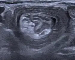An intussusception is often suspected based on history and physical exam, including observation of Dance's sign. A digital rectal examination is particularly helpful in children, as part of the intussusceptum may be felt by the finger. A definite diagnosis often requires confirmation by diagnostic imaging modalities. Ultrasound is the imaging modality of choice for diagnosis and exclusion of intussusception, due to its high accuracy and lack of radiation. The appearance of target sign (also called "doughnut sign" on a sonograph, usually around 3 cm in diameter, confirms the diagnosis. The image seen on transverse sonography or computed tomography is that of a doughnut shape, created by the hyperechoic central core of bowel and mesentery surrounded by the hypoechoic outer edematous bowel.[10] In longitudinal imaging, intussusception resembles a sandwich.[10] It is also called "pseudokidney" sign because hyperechoic tubular centre is covered by a hypoechoic rim producing a kidney-like appearance.[11]