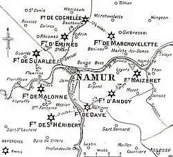 Namur was defended by a ring of modern fortresses, known as the fortified position of Namur (position fortifiée de Namur) and guarded by the Belgian 4th Division. When the siege began on 20 August, the Germans reversed the tactics used at Liège, by waiting until the siege train arrived from Liège and bombarding the forts before attacking with infantry. French troops sent to relieve the city were defeated at the Battle of Charleroi and only a few managed to participate in the fighting for Namur. The forts were destroyed in the bombardment, much of the Belgian 4th Division withdrew to the south, and the Belgian fortress troops were forced to surrender on 24 August. The Belgians had held the German advance for several days longer than the Germans had anticipated, which allowed Belgium and France more time to mobilise.[19] The Belgian army had c. 15,000 casualties of whom c. 10,000 were from the 4th Division, which was moved to Le Havre and then by sea to Ostend on 27 August, from where it re-joined the field army at Antwerp.[20] Der Weltkrieg, the German official history recorded the taking of 6,700 Belgian and French prisoners and twelve field guns, and 900 German casualties, of whom c. 300 were killed.[21]