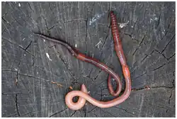 Invasive species of earthworms from the suborder Lumbricina have been expanding their range in North America.[1] Earthworms are considered one of the most abundant macroinvertebrates in the soil of ecosystems in temperate and tropical climates.[2] There are around 3,000 species known worldwide.[2] They are considered keystone species in their native habitats of Asia and Europe because, as detritivores, they alter many different variables of their ecosystem.[3] Their introduction to North America has had marked effects on the nutrient cycles and soil profiles in temperate forests. These earthworms increase the cycling and leaching of nutrients by breaking up decaying organic matter and spreading it into the soil. This thins out the soil rapidly because earthworms do not require a mate to reproduce, allowing them to spread fast.[4] Since plants native to these northern forests are evolutionarily adapted to the presence of thick layers of decaying organic matter, the introduction of worms can lead to a loss of biodiversity as young plants face less nutrient-rich conditions. Some species of trees and other plants may be incapable of surviving such changes in available nutrients.[5] This change in the plant diversity in turn affects other organisms and often leads to increased invasions of other exotic species as well as overall forest decline.[3][6] They are considered one of the most invasive animals in the Midwestern United States along with feral swine.[7]