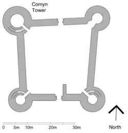 Inverlochy is now a ruin, but is unusual because it has remained unaltered since it was built in the reign of King Alexander III. The castle is sited on the south bank of the River Lochy, at the strategically important entrance to the Great Glen, a key passage through the Scottish Highlands. With one side defended by the river, the castle's other three sides were originally protected by a water-filled ditch.[1] Inverlochy is a castle of enceinte, with its main defence being a substantial curtain wall. The simple layout comprises a quadrangular courtyard, 31 by 27 metres (102 by 89 ft) across, surrounded by a wall up to 2.7 metres (8.9 ft) thick and up to 7.6 metres (25 ft) high, with round towers at each corner.[3] The largest of these, known as the Comyn Tower, is 6.1 metres (20 ft) across the interior, and served as the castle's "donjon", or keep. The smaller towers are 14 feet (4.3 m), and all four have stairways curving up within the thickness of the walls.[3] The main entrance was to the south, with a "water gate" facing the river to the north.[1] Both entrances were defended by a portcullis, and the south door may have had an interior gatehouse.[3]