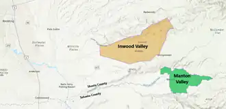 Inwood Valley is an American Viticultural Area (AVA) located in southern Shasta County, in north-central California. It was established on September 12, 2012, by the Alcohol and Tobacco Tax and Trade Bureau (TTB), Treasury after reviewing the petition submitted by consulting geographer Patrick Shabram, on behalf of himself and Anselmo Vineyards of Inwood Valley, proposing a viticultural area named "Inwood Valley."[4]