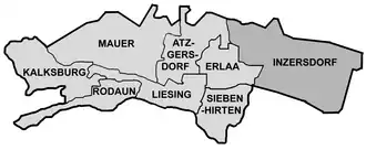 - ^ An exact number can not be delivered because the registration districts do not match with the cadastral communes. The registration districts Blumental, Draschegründe, Inzersdorf, Neu-Erlaa-Neustift and Schwarze Haide altogether had 14.694 inheritants in 2001. – Source: Ortsverzeichnis 2001 Wien, published by Statistik Austria, Vienna 2005, p. 101-102