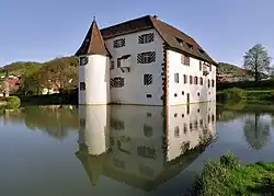From the Fondation Beyeler, a famous art collection in Riehen in the canton Basel Stadt, Switzerland, the street Inzlingerstrasse goes uphill to Inzlingen. By crossing the border the street is called Riehenstrasse and it ends at the moated castle.