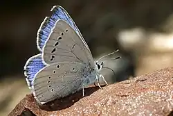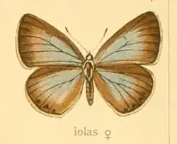 Iolana iolas, the iolas blue, is a butterfly of the family Lycaenidae. It is found in northern Africa, southern Spain, southern France, southern Europe, Asia Minor and Iran. The wingspan of the male is 18–21 mm (0.71–0.83 in). The flight period is May to June in rocky places at around 2,000 m (6,600 ft). The larva feeds on Colutea arborescens.