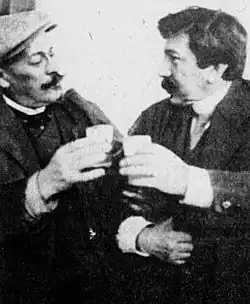 Ion Luca Caragiale was discreet about his ethnic origin for the larger part of his life. In parallel, his foreign roots came to the attention of his adversaries, who used them as arguments in various polemics.[6][14][17][18] As his relations with Caragiale degenerated into hostility, Mihai Eminescu is known to have referred to his former friend as "that Greek swindler".[19] Aware of such treatment, the writer considered all references to his lineage to be insults.[14] On several occasions, he preferred to indicate that he was "of obscure birth".[3]