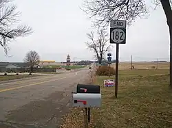 Iowa Highway 182 begins at an intersection with US 18 and County Road A42 (CR A42). At the intersection, eastbound US 18 approaches from the west, eastbound US 18 approaches from the south, and CR A42 approaches from the east. Iowa 182 travels north through Inwood for one mile (1.6 km) and continues due north through the farmland of Lyon County for eight miles (13 km) to an intersection with Iowa Highway 9.[1] The intersection with Iowa 9 is very similar to the intersection with US 18; eastbound Iowa 9 approaches from the north and westbound Iowa 9 approaches from the east.[2]