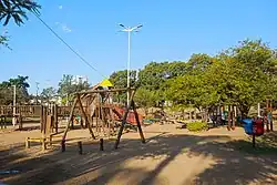 The walking and biking paths that intercede the park allow direct access to nearby neighborhoods, such as Canaã and Iguaçu.[13][14] Besides the lake, there are soccer fields, courts, an amphitheater and a playground for children inside the park.[10] Next to the leisure area is the Science Park, where physical, biological, chemical and astronomical phenomena can be observed or interacted with by the visitor.[10] In the same space as the Science Park and the playground are also the "whispering corner", the "path of the stars", the "water cloud" and the sundial.[15]