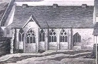 Kirby shows the refectory to have had tracery windows in the Decorated Gothic style, progressing from a geometric form at the north end to more curvilinear forms to the south, suggesting a sequence of construction from the late 13th to early 14th century. The final window has perpendicular mullions (a later style). The gable extension at the second window contained the raised lectern from which homilies or scriptures were read at mealtimes and (as Kirby's Plan shows) was approached externally by steps on the south side. The windows are raised to be set above the level of the seated diners. The upper end of this hall was to the north, and the later window and final bay probably mark the position of the screens passage at the lower end giving access to the buttery or pantry.[53] This building was used as a schoolroom until demolished in 1763, when the school moved into the old dormitory.[54] The windows either side of the chapter house doorway were also in curvilinear style.