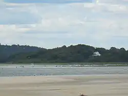 Both tributary creeks enter and mingle with the Ipswich proper in Middleton, proceed south into northern Peabody, then loop northwards through the municipalities of Danvers, Topsfield (crossing US Route 1 just south of the Topsfield Fairground, entering from the west turns northerly and runs the greater length of Teal Pond southwest to north, the east bank of which forms a part of the western border of Hamilton, and exits the lake turning easterly staying south of Ipswich Road to head through and between the Willowdale State Forest and Bradley Palmer State Park, then opens a gap from Ipswich road diverging southeasterly from the road and the south edge of the Turner Hill Golf Club to turn north and form the west border of the Julia Bird Reservation thence meanders north through settled Ipswich neighborhoods and directly through town center passing under MA 133 (County Road, aka. South Main Street) where it gradually begins widening until a mile beyond main Street it passes Nichols Field and the salt marsh floodplain begins. From Nichols it traverses a bit over 2.5 miles (4.0 km)[6] joins with Plum Island Sound in connecting with the Atlantic Ocean at Ipswich Bay.[7] There is always some flow from the river into the bay. However, the lower Ipswich and Plum Island Sound, as well as the lower four other rivers flowing into it, and the much larger Merrimack River to the north, are all tidal estuaries, so the water is brackish from mixing ocean born saltwater inland during flood tides, and the lands immediately along the banks, where not inundated some of the time, are nonetheless saturated by brackish water and support only hearty plants capable of tolerating the waters such as salt marsh hay. High tides cover all of Great Marsh and the flood plains of the lower rivers. Low tides uncover the mud flats, reducing the deep channels to small streams some often small enough one can hop across to fish elsewhere.