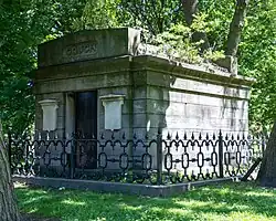 After Couch's death, his family built a mausoleum in Chicago's City Cemetery.[6] He was entombed in it eighteen months after his death, making it his final resting place.[1] The mausoleum was designed by John M. Van Osdel, who had also designed the grand reconstruction of the Tremont House.[7][8] Its construction attracted great attention.[8] Beginning in the 1860s, the city began relocating corpses from the cemetery and reinterring them elsewhere, and the land was transformed into Lincoln Park. Today, Couch's tomb is the only remaining marked grave in the land that was once occupied the City Cemetery.[6] The tomb is located near the Chicago History Museum building.[6]