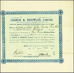 Lucien Alphonse Legros (1866-1933), O.B.E., M.I.Mech.E., M.I.C.E.,[2] son of the artist Alphonse Legros, and Guy Knowles, scion of a wealthy and artistic family, founded Legros & Knowles Ltd in Cumberland Park, Willesden Junction, Willesden, London in 1904 to build and repair vehicles. They had met while Knowles was studying art under Alphonze Legros. Knowles provided most of the financial capital while Legros, an older, experienced tramway engineer, was the main designer.[3][4]