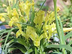 The flowers come in a range of shades of yellow, from pale yellow,[4] to soft yellow,[2] and rich-yellow.[5] The perianth tube generally is about 3 – 4.5 cm long.[3] It has falls that have a wide wing and a raised pale yellow crest, the standards are short and deflexed.[6]