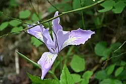 The plants have unbranched flower stems that bear 2 or 3 flowers. The plants do clump quickly and produce many stems.[1] They prefer acid soils. (all except 'Iris douglasiana', which prefers alkaline soils).[2] In the wild, all the species are located on soils on slopes with good drainage. They grow at the edge of woods. They do not like root disturbance, so can be difficult to cultivate for the gardener.[4][1] They can be grown in large clay pots in the UK, to be able to protect them in the winter.[2] or they could be grown from seed, to stop root disturbance.[4] Most flower between mid spring to early summer.[1] April to June (in the UK).[2] The leaves can turn red in the autumn.[5] They have been used to create various hybrids, mostly in America.[2]