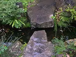 The journey starts at the gateway from oblivion, through which the pilgrim soul enters among the trees and passes into the open where is a small cavern, the cave of birth, crowned by a cherry tree. Here a short winding sunken path symbolises the years of Childhood, unseeing and unknowing, whence we come to a mound of rock. Through this the tunnelled pathway leads from the darkness into the light from ignorance to the unfolding knowledge. Half way through the winding is an opening leading to steps to the hill of learning crowded by an ancient fir tree. Often this fir crowned height tempts the student to look too high but there is an unguarded hole to teach him vigilance before he comes down the hill to the level of his fellows. Following the winding course still guarded by rocks he reaches the parting of the ways. On the right ambition on the left is the straight path of austere living in the centre is the path to wedded life by which the pilgrim reaches the tiny island of joy and wonder, across the stepping stones of exploration. But he cannot stay there. All paths lead to further temptation across a stone bridge to the bamboo bridge and the geisha house but beyond them is the hill of ambition and the well of wisdom is in sight across the beautiful water. Very steep is the hill and those who climb may be separated but as they climb they reach out a helping hands and are united at the top. Descending the pilgrim finds an easy bridge across the roaring falls and treads the stepping stones through the level garden of peace and contentment to the hill of mourning where his soul goes forth through the gate of eternity.