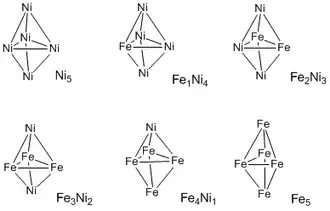 Iron–nickel (Fe–Ni) clusters are metal clusters consisting of iron and nickel, i.e. Fe–Ni structures displaying polyhedral frameworks held together by two or more metal–metal bonds per metal atom, where the metal atoms are located at the vertices of closed, triangulated polyhedra.[1]