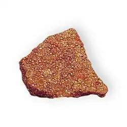 Ironstones consist of 15% iron or more in composition. This is necessary for the rock to even be considered an iron-rich sedimentary rock. Generally, they are from the Phanerozoic which means that they range in age from the present to 540 million years ago.[1] They can contain iron minerals from the following groups: oxides, carbonates, and silicates. Some examples of minerals in iron-rich rocks containing oxides are limonite, hematite, and magnetite. An example of a mineral in iron-rich rock containing carbonates is siderite and an example of minerals in an iron-rich rock containing silicate is chamosite.[2] They are often interbedded with limestones, shales, and fine-grained sandstones. They are typically nonbanded, however they can be very coarsely banded on occasion.[1] They are hard and non-cherty.[2] The components of the rock range in size from sand to mud, but do not contain a lot of silica. They are also more aluminous. They are not laminated and sometimes contain ooids. Ooids can be a distinct characteristic though they are not normally a main component of ironstones. Within ironstones, ooids are made up of iron silicates and/or iron oxides and sometimes occur in alternating laminae. They normally contain fossil debris and sometimes the fossils are partly or entirely replaced by iron minerals. A good example of this is pyritization. They are smaller in size and less likely to be deformed or metamorphosed than iron formations.[3] The term iron ball is occasionally used to describe an ironstone nodule.[2]
