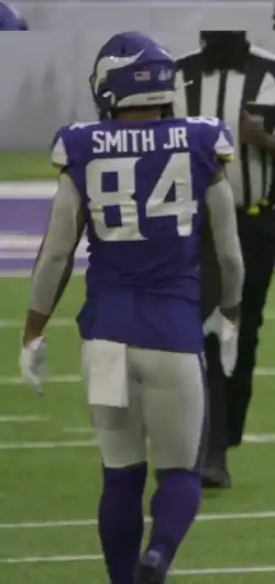Smith was drafted by the Minnesota Vikings in the second round with the 50th overall pick in the 2019 NFL Draft.[9] Smith made his NFL debut in Week 1 against the Atlanta Falcons but did not record any meaningful statistics.[10] He recorded his first reception in the next game against the Green Bay Packers.[11] He recorded a season-high and team-leading 60 receiving yards on three receptions against the Oakland Raiders in the following game.[12] He scored his first touchdown in Week 11 against the Denver Broncos on a 10-yard reception from Kirk Cousins.[13] Overall, as a rookie, he appeared in all 16 games and started six. He recorded 36 receptions for 311 receiving yards and two receiving touchdowns.[14]