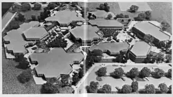 The campus itself is notable for its architecture. It was designed by architect Ron D. Young in the Brutalist architecture style, and built largely of tilt up concrete slabs featuring distinctive cast geometric inlays. The shapes and angles of floor plans and design motifs were based on the hexagon. The initial layout of the Humanities building envisioned two or three teachers and their respective students sharing a single open plan hexagonal room, but this quickly proved too distracting. Portable office dividers were placed in a line to define classroom boundaries, but noise was still a problem. After two years of such conditions, walls were erected to close off the large, open hexagons.