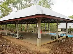 In 1891 a playshed was built at Irvinebank State School.[24] The Queensland education system recognised the importance of play in the school curriculum and, as school sites were originally cleared of all vegetation, the provision of all-weather outdoor space was needed. Playsheds were designed as free-standing shelters, with fixed timber seating between posts and earth or decomposed granite floors that provided covered play space and doubled as teaching space when needed These structures were timber-framed and generally open sided, although some were partially enclosed with timber boards or corrugated galvanised iron sheets.[25] The hipped (or less frequently, gabled) roofs were clad with timber shingles or corrugated iron. Playsheds were a typical addition to state schools across Queensland between c. 1880s and the 1950s, although less frequently constructed after c. 1909, with the introduction of highset school buildings with understorey play areas. Built to standard designs, playsheds that ranged in size relative to student numbers.[26] The playshed at Irvinebank was typical of the standard designs. Standing at a distance behind of the teaching building, it was a timber-framed, 10-post open-sided shelter, 30 by 20 feet (9.1 m × 6.1 m) with a hipped roof and perimeter seats.[1]
