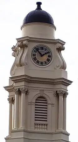 At the second story of the front facade, there is a balustraded projecting portico three bays wide with freestanding engaged Ionic columns and Doric pilasters supporting a full entablature with denticulated pediment. It is in turn topped with a three-stage wooden clock tower with round-arched louvered openings, paired Corinthian columns supporting block entablatures and paired scroll brackets. The very top of Town Hall is the clock tower's domed roof. This feature has made the clock tower one of Irvington's most recognizable local landmarks.[1]