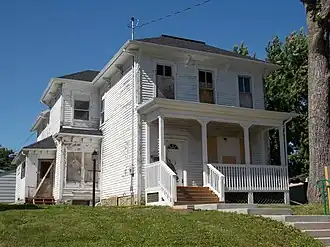 The Isaac W. Harrison House is a historic building located in the Cork Hill neighborhood of Davenport, Iowa, United States. It is a somewhat simplified version of the Italianate style found in the city of Davenport. The house is a two-story, three–bay, frame structure with an entrance that is to the left of center. Like many early Italianate homes in Davenport it retained some features of the Greek Revival style. These are found in the glass framed doorway and the simple window pediments.[2] It is also features bracketed eaves and is capped with a hipped roof.