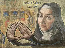 Born Elionor de Villena in 1430[2] Isabel was the illegitimate child of Enrique de Villena, an aristocrat and writer who was related to the royal line of Castile and Aragon,[3] and an unknown noblewoman.[4] She was raised by Queen Maria of Castile of Valencia from the time she was four. She lived in the court of Alfonso V of Aragon (the Magnanimous) and was educated there until 1445 when she became a nun in the Monastery of la Trinidad. She was fifteen years old.[5] This monastery, La Trinitat, was founded by Queen Maria de Luna, who was also the chief benefactor.[6] Isabel was elected abbess of the convent in 1462 and took charge in 1463.[7] According to Rosanna Cantavella, a scholar who has extensively studied Sor Isabel, there was a rumor that there had to be divine intervention from the Archangel Michael that allowed Isabel to be elected as abbess, simply because it would have been very difficult for her to be elected on her own because she was an illegitimate child.[8] Illegitimate children were not usually eligible for such positions, but Isabel was elected anyway.