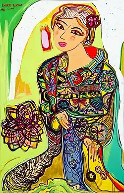 In 1996, Tuchband created a public masterpiece with the panel São Paulo Viva at Santa Cruz subway station in collaboration with the artist Verena Matzen, in São Paulo. The 6.5 square metres (70 sq ft) mural consisted of 180 hand-painted ceramic pieces, installed with the collaboration of the architect Paula Pedrosa, Arte no Metrô project of the City Government of São Paulo.[2] In 1999, her name was included in the Bénézit Dictionary (ed. Gründ, 1999), a reference dictionary of painters, sculptors, designers and engravers all over the world.[3] Tuchband created fresco paintings to the company Unilever in São Paulo in 2004. In 2007, she was invited to create an artwork in celebration of the company O Boticário. The same year, her work O Amor Move o Mundo competed in Abril Journalism Award.[4]