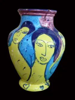 The bright color is an omnipresent element in the work of Isabelle Tuchband. The colorful canvas painted in acrylic usually represent women, flowers and enchanted worlds. Isabelle loves portraying people and families. She also uses collage on the surface of the canvas. Ceramic vases and plates are also part of the painter’s collections. When it comes to painting, her favorite source of inspiration is music.