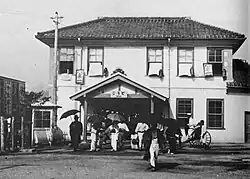 During the two years that Isaniwa Yukiya served as a mayor, he changed many things. First, he began charging money fora free outdoor hot spring for cures, because the hot spring was old, it needed to renew.[7] Then he rebuilt the hot spring for cures in 1892.[8] And then he planned to renew the main hot spring.[9] Yukiya planned Dōgo Onsen to have a third floor which was rare in those days for Japan, Japanese style mixed with European style building, red and blue Giyaman glass (Dutch style glass) used [10] and looks rich and powerful building, because the main hot spring had good quality, Yukiya didn't want to Dōgo Onsen looks usual type of other buildings.[11] He asked Sakamoto Hachiro, a carpenter for castle, to make it and Sakamoto built it in 1894. It took for 20 months to build.[5] And he also founded Dogo train corporation and he asked to make the train rail to Dogo through Ichiban-cho in 1897, because Yukiya thought Dōgo Onsen Station[12] makes people come and visit to Dogo Yunomachi.[13] And in the same year, he made the park around the Dōgo Onsen and for people to enjoy sweets, he made red and white Yuzarashi Dango, today's Botchan Dango. However, most people of the city disagreed with his these ideas until they saw the new Dōgo Onsen.[14]