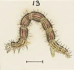 The young larva, immediately after first moult, is about 1⁄8 inch in length, dull ochreous with a conspicuous blackish dorsal line and three or four fine, bright red, lateral lines, another blackish line being situated below the spiracles; the head is pale ochreous dotted with black, and the entire larva is clothed with father long black hairs.[10]