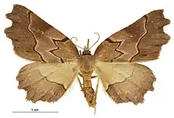 This charming Phalenite is a most curious species. The wings are cut in an altogether peculiar manner. Superior having each at the apex two triangular excisions, the first of which is very deep (the inferior have also two excisions near the middle); they are testaceous-yellow, more or less tinged with violet, and with two deep black, well marked median lines; the first line forms, above and beneath the median nervure, two very acute angles; the second forms also two corresponding angles, but more open and blunter, and is bordered on the inside with paler; between the two lines is a brown mai-k on the costa, and a black dot beneath it; opposite to the second angle of the elbowed line are two more black dots, and finally some black markings near the terminal excision : inferior with only one line, which becomes obliterated near the middle of the wing. In well-marked specimens there is also a pale subterminal line common to all the wings. The under-side is of a more lively yellow, strongly varied with ferruginous, with the same lines and dots as the upper-side, but less marked and reddish : on the inferior is a median band, toothed inferiorily and surmounted, in the cellule, by an oval ferruginous dot, traversed by a fine white line, which divides the cellule in two parts, and is prolonged to the apical margin. The whole body is coloured as in the wings.[6]