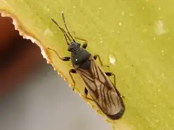 Adult bugs are 4-6mm long,[3] very slender elliptical overall and have a black base color. The rear edge of the pronotum, parts of the hemelytra, the tibiae and tarsi, and the tips of the femora, are yellow-brown in colour. The species is dimorphic: some individuals are macropterous (fully winged) and others micropterous (very short winged).[4] The two types are estimated to be roughly equally numerous.[5] A form with wings of intermediate length is occasionally found.[6] Nymphs are of a similar shape with the hind part of the abdomen scarlet.[6]