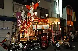 Ishidori Matsuri (石取祭) can be literally translated from Japanese as "stone bringing festival." It is a festival in Kuwana, located in Mie Prefecture. The festival starts on the first Saturday of August, at midnight, and runs throughout the weekend.[1] Every town within the central part of the city has its own 3 wheeled, highly decorative festival cart. Each cart has a large taiko drum at the back and several kane along the sides. Each town has a particular sequence for each of those instruments, creating a unique and identifying sound. Another identifying feature is the placement of the kakegoe, or shouts. Over the course of the weekend, the carts are pulled toward Kasuga Shrine for presentation, performing along the way. With over 30 carts with distinct rhythms, it has been said that the Kuwana festival is the loudest festival in Japan.[2]