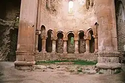 In this manuscript it is stated that Saba, the nephew and follower of the priest Gregory of Khandzta,[1] founded a monastery on the site of an earlier church. The first church built by catholicos Nerses III (641-661), who was native from the village of Ishkhan, and is also known as Nerses III Ishkhanetsi,[2][3][4] had a tetraconch plan (a central dome with four apses radiating to the cardinal points) and was presumably damaged during the Arab invasions of the 7th century. Five Georgian inscriptions within the church and on the southern facade indicate different restoration periods, from 917 until 1032. From the 12th to the end of the 14th century, large vestibules were added to the south, west and north facades. The monastery used to be one of the five patriarchates of Tao-Klarjeti and its church functioned as a cathedral until the 17th century. It was used as the headquarters for the Ottoman officers during the Russo-Turkish War in the 19th century, while its west arm was converted into a mosque and remained so until 1983. In 1987, the Ministry of Culture and Tourism (Turkey) registered İshkhhan as a national cultural monument and the site is now protected. In 2013, the Monastery was being renovated.[5]