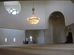 In 1963, the MSA invited Pakistani-Canadian architect Dr. Gulzar Haider to design a headquarters mosque for the Plainfield society.[7] Haider "eschewed minarets, domes and other hallmarks of Islamic architecture to focus on geometry."[8] In 1981, the mosque was completed, featuring "prayer space, a library, and administrative offices."[9][10] It was in use by the following year.[9]