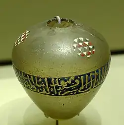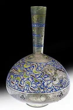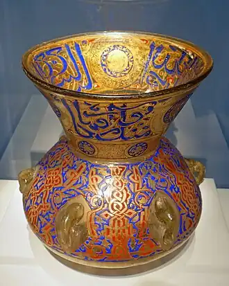 [55] A study of various enamelled vessels, including beakers and mosque lamps, suggests that there are two subtle yet distinct firing practices, possibly representing two distinct production centres or glass-working traditions.[56] Due to its high demand, enamelled glass was exported throughout the Islamic world, Europe, and China during this period.[57] Enamelling of glass eventually ended in Syria and Egypt following disruption by various Mongol invasions from the 13th through to the 15th centuries AD.[58]