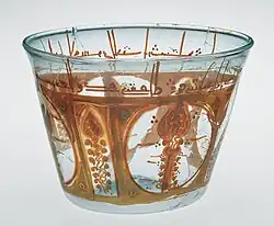 A feature of glass from the Middle Islamic Period is the increased interaction between the Middle East and Europe. The Crusades allowed for the European discovery of Islamic gilded and enamelled vessels. The 'Goblet of the Eight Princes' brought to France from the Levant is one of the earliest examples of this technique.[57] Furthermore, large amounts of raw plant ash were exported solely to Venice, fuelling that city's glass industries.[59] It was also in Venice that enamelling was resurrected following its decline in the Islamic world.[56]