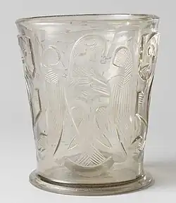 Hedwig glass with eagle, Rijksmuseum, wheel-cut relief with hatched details, 12th-century. Imitating rock crystal and exported to Europe.