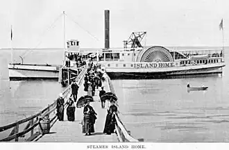 Island Home first arrived at Nantucket on September 5, 1855 under the command of Capt. Thomas Brown. It was the first purchase of the new Nantucket and Cape Cod Steamboat Co., which had been formed from the Nantucket Steamboat Co. earlier that year when the new railroad terminus wharf was built in Hyannis, Massachusetts. It was 184 feet long, with a 29'8" beam and measured 536 tons. It initially sailed the waters between Hyannis and Nantucket.[2][3][4][5] Capt. Brown had previously commanded the island ferry steamers Eagle's Wing and Massachusetts. He was followed by Capt. Nathan Manter (1818–1897), who commanded the Island Home for thirty years.[2]