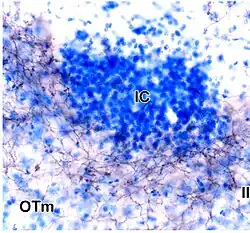 Islands of Calleja of rat brain stained in blue. Denoted under IC abbreviation.