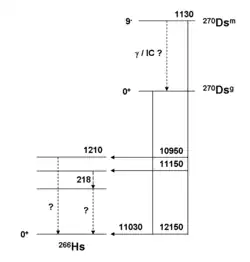 The direct production of 270Ds has clearly identified two nuclear isomers. The ground state decays by alpha emission into the ground state of 266Hs by emitting an alpha particle with energy 11.03 MeV and has a half-life of 0.10 ms. The metastable state decays by alpha emission, emitting alpha particles with energies of 12.15, 11.15, and 10.95 MeV, and has a half-life of 6 ms. When the metastable state emits an alpha particle of energy 12.15 MeV, it decays into the ground state of 266Hs, indicating that it has 1.12 MeV of excess energy.[21]