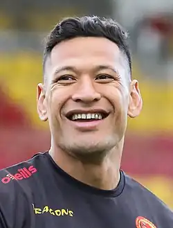 Israel ‘Isileli Folau (Tongan: [fo'lɑʊ̯]; born 3 April 1989) is a professional dual-code rugby player who plays as a fullback for Japan Rugby League One club Urayasu D-Rocks. Born in Australia, he represents Tonga at international level after qualifying on ancestry grounds.