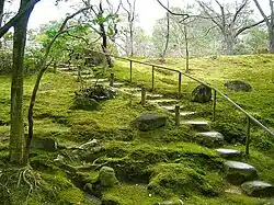 The site of the western garden originally formed part of Manishu-in, a minor temple which was part of the larger temple of Kofuku-ji. The ground was bought in the 1670, during the Enpō era by Kiyosumi Michikiyo, a wealthy tanner.[2] He restructured the gardens between 1673 and 1681 and built two houses: the Sanshu-tei and Tei-shu-Ken, as the family home. These were built with thatched roofs. The name Sanshu-tei ("house of the three wonders") was given by Mokuan, the large priest of the Manpuku-ji temple of the school Zen Oubaku with Uji.