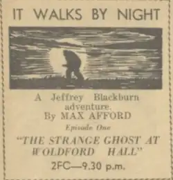 It Walks by Night is an Australian radio serial by Max Afford featuring his detective hero, Jeffrey Blackburn.[1][2]